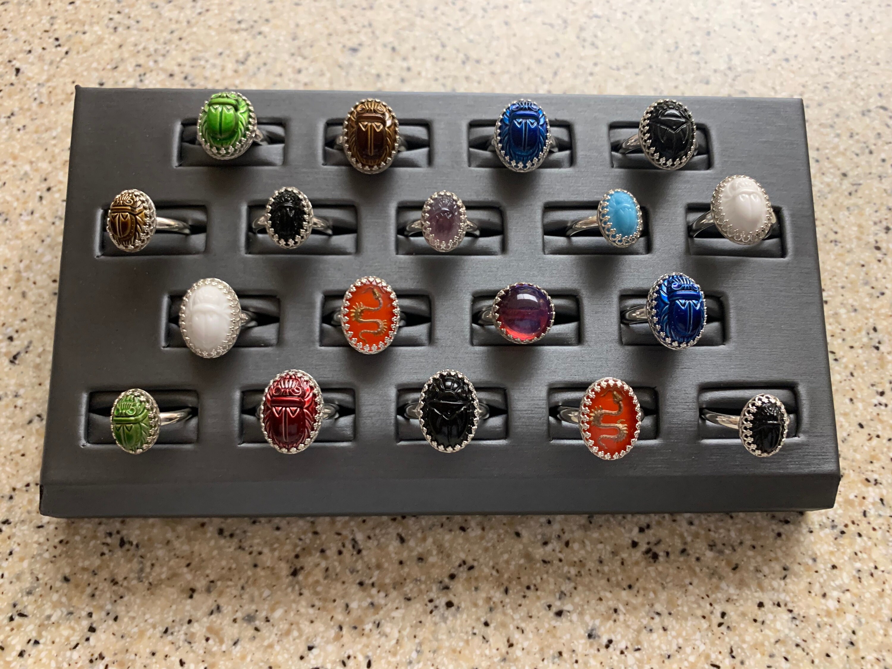 These vintage glass scarab beads are fresh from their original Cherry Brand packaging, offering authentic mid-century charm and collectible appeal. Each piece is etched on both sides, featuring a detailed scarab on the front and hieroglyphics on the back, adding depth and historical-inspired design.