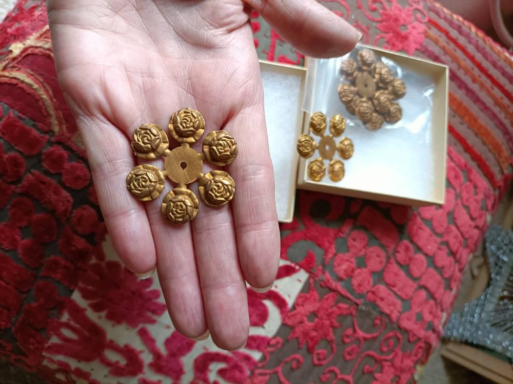These are raw brass “pinwheels” with 6 deeply stamped roses. The center circle that connects them all has a center hole. The flowers can bend up or down to suit your needs. Each piec measures 39mm over all with the center circle measuring 14mm. You will receive 5 pieces.