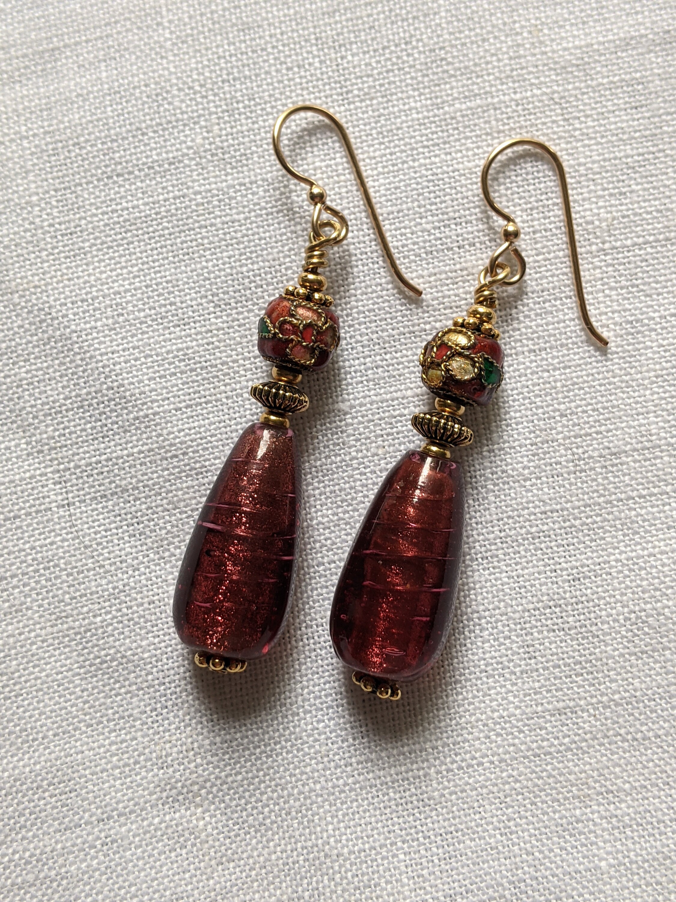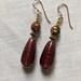 I don't mow much about these except the color is stunning. There looks to be a base of gold. aventurine with spirals of the same color embedded in what looks like cranberry. These measure 22 mm long x 10mm wide and are perfect for drops. You will receive 5 beads